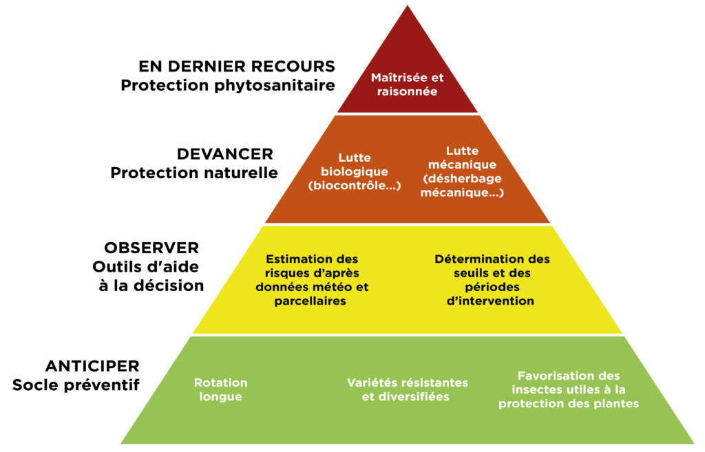 La protection intégrée repose sur un principe de priorisation des leviers d’action. On privilégie d’abord les mesures les plus durables et préventives avant de recourir, en dernier ressort, à l’application de produits de synthèse de protection des plantes.
